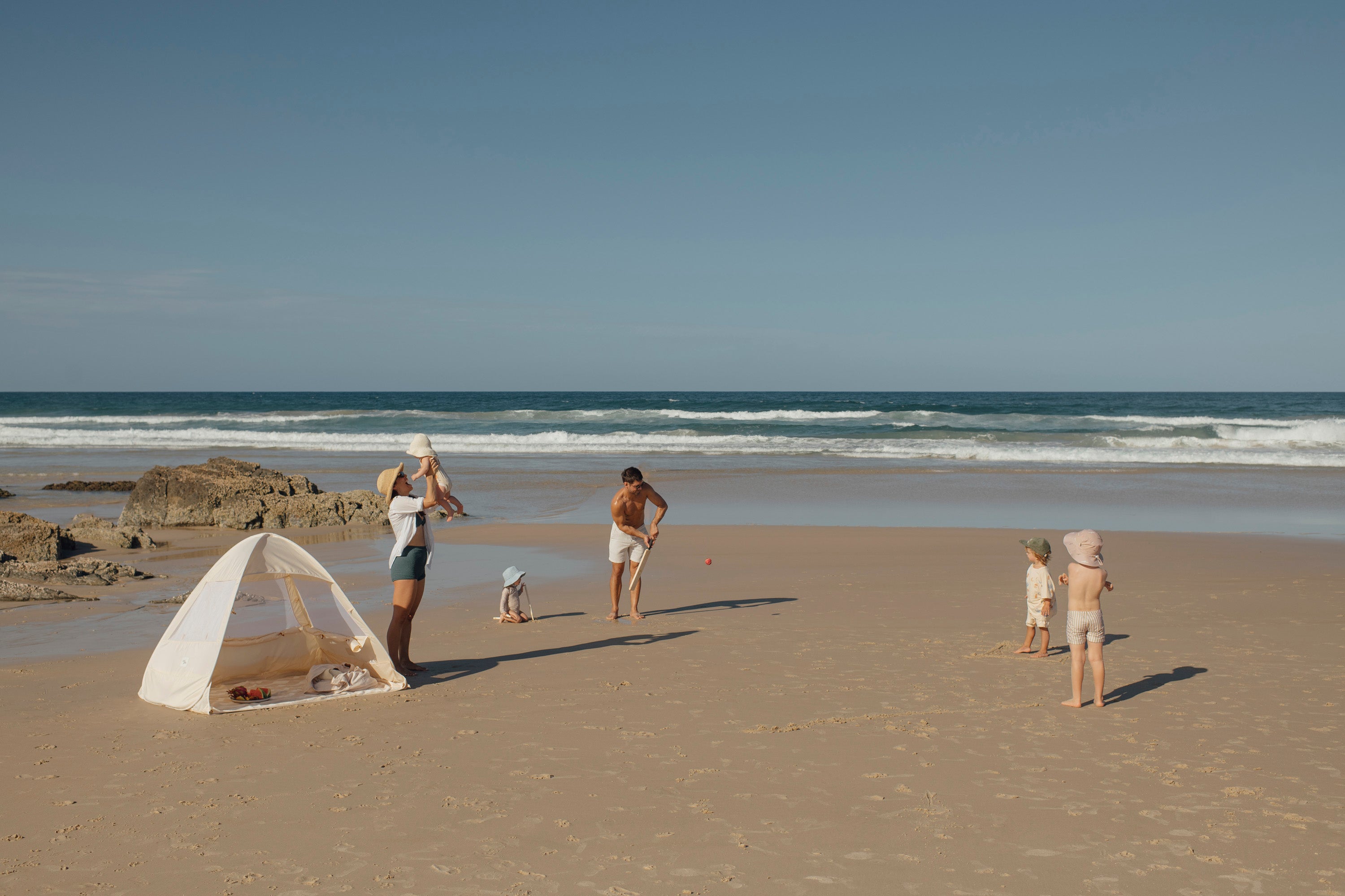 At the beach? We've designed the tent with outer sand pockets on all three sides. Just fill them up to add some weight and keep it from moving.